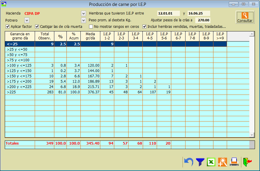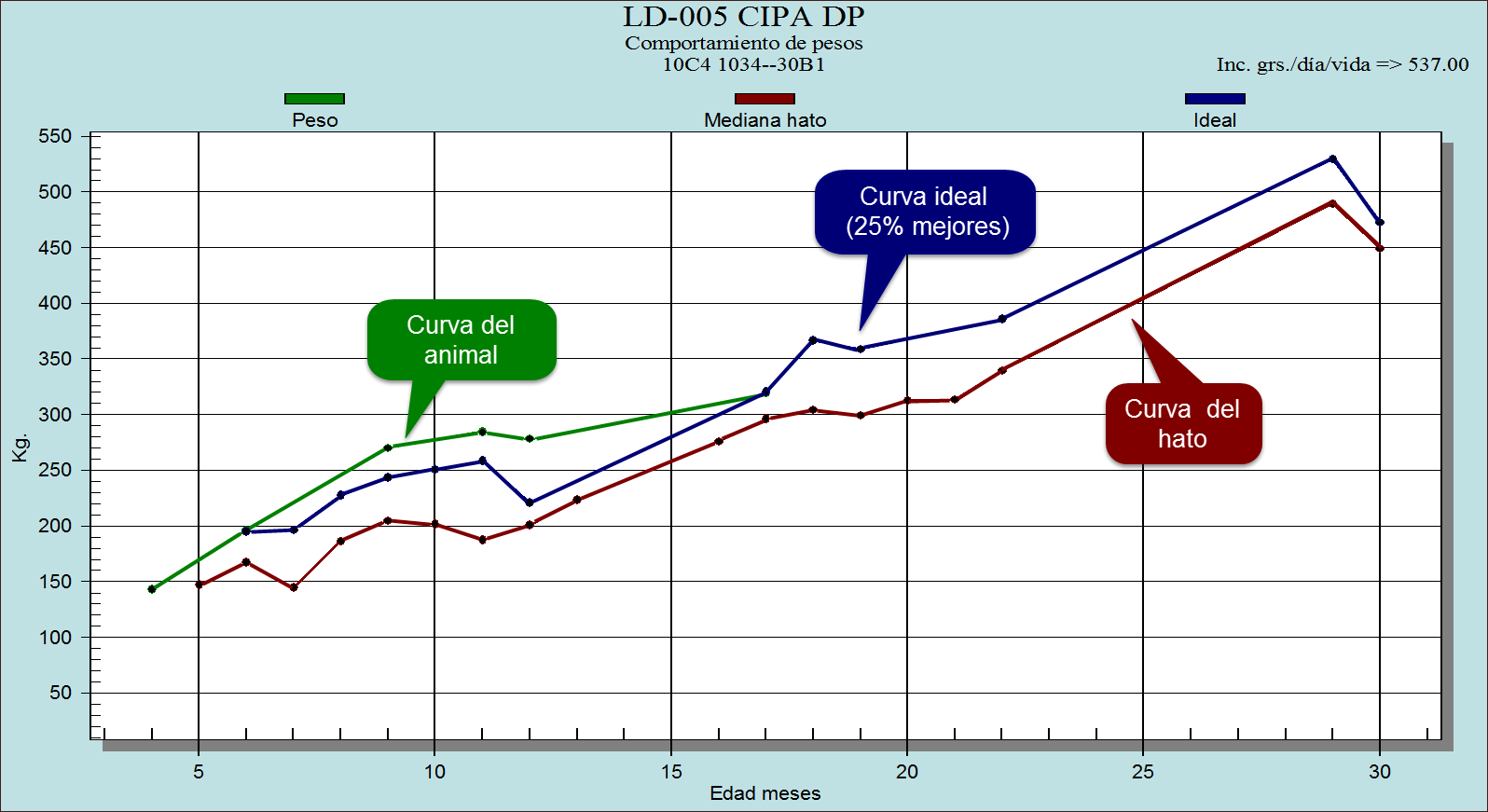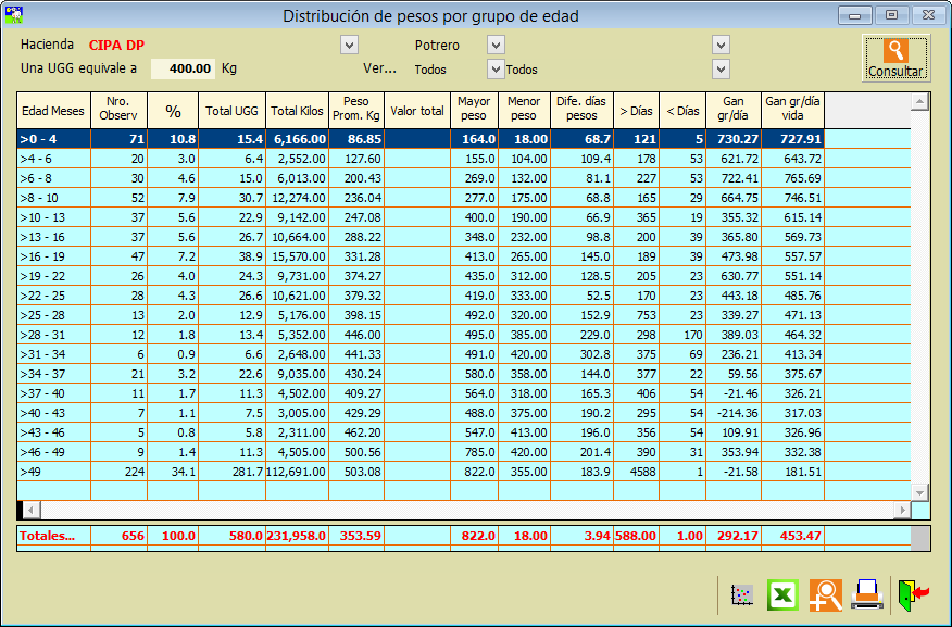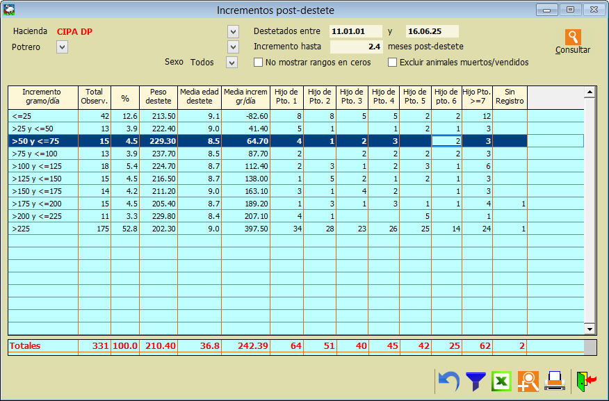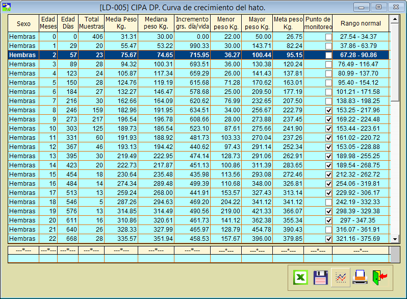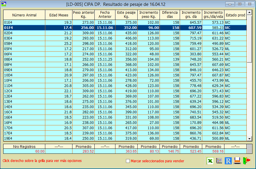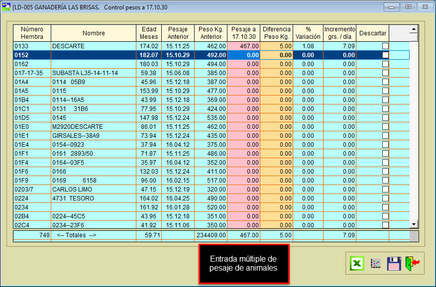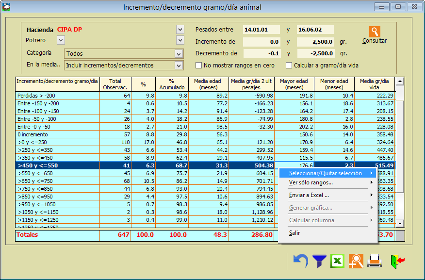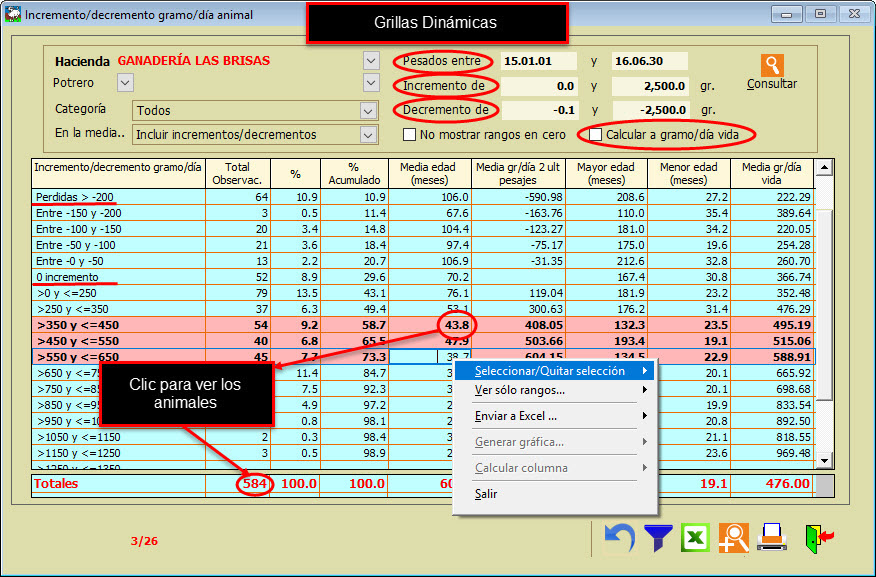 Analice fácilmente el incremento / decremento de gramo/día animal